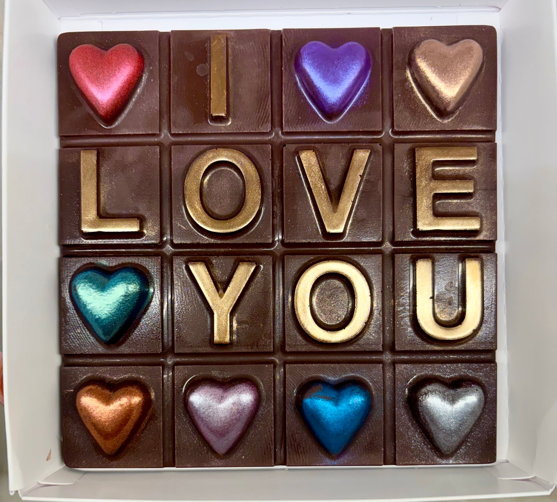 Celebrate love with our exquisite Valentine's Day "I Love You" Chocolate Bar—a delicious declaration of affection. This premium 5" by 5" by 1/4" chocolate creation features hand-decorated edible shimmer that catches the light beautifully, making every bite feel special. The heartfelt "I love you" message is elegantly displayed, transforming a simple treat into a meaningful gesture. Perfect for expressing your deepest feelings, this indulgent chocolate bar arrives in an elegant Valentine's Day gift box, ready to impress your sweetheart. Whether you're celebrating an anniversary, proposing, or simply reminding someone how much they mean to you, this artisan chocolate bar delivers both taste and sentiment. Make this Valentine's Day unforgettable with a gift that speaks straight from the heart.